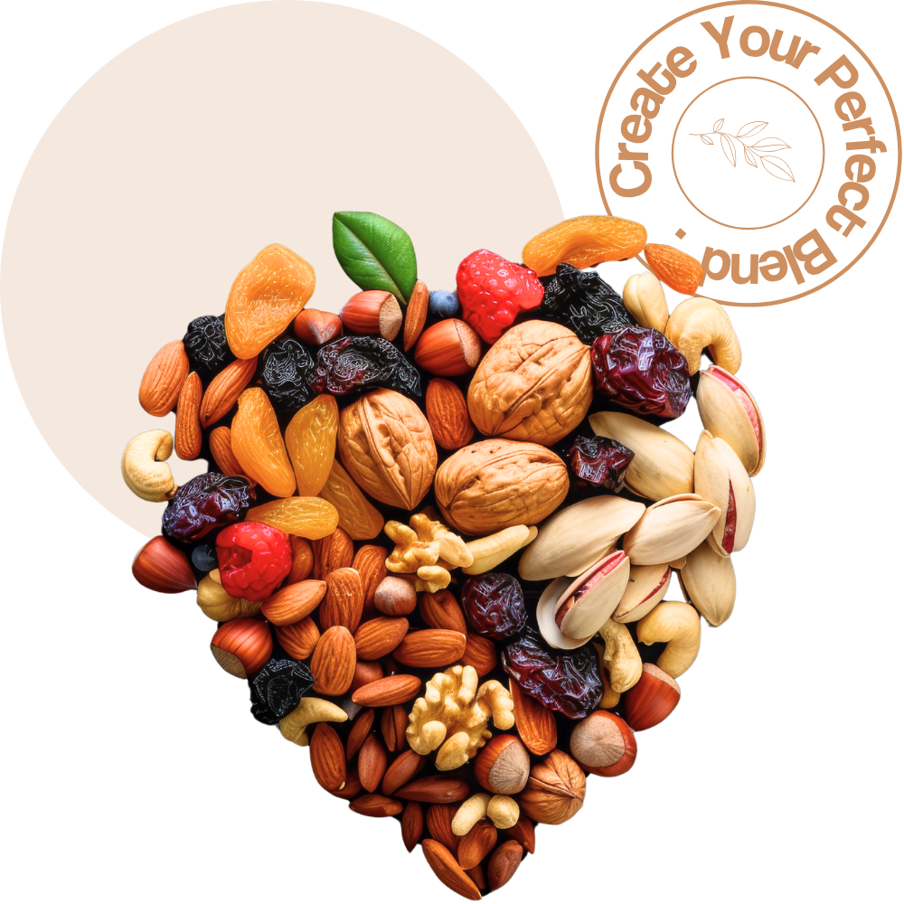 Bring your snacking vision to life with our handpicked selection of nuts, dried fruits, and delightful extras — all blended your way for flavor that’s uniquely yours.